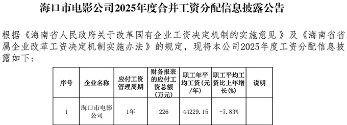 海口市电影公司2025年度合并工资分配信息披露公告